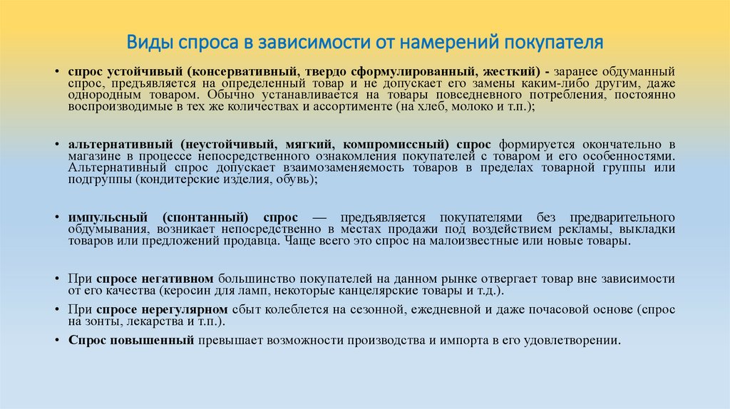 Виды спроса в зависимости от намерений покупателя• спрос устойчивый (консервативный, твердо сформулированный, жесткий) - заранее обдуманный
