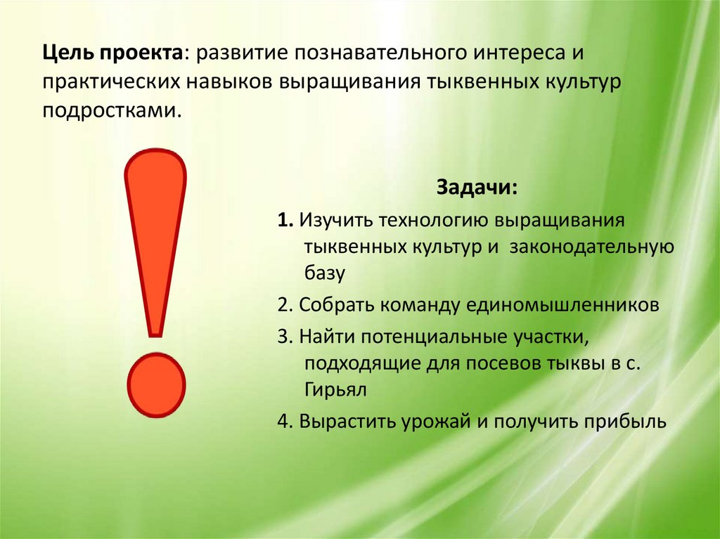 Цель проекта: развитие познавательного интереса ипрактических навыков выращивания тыквенных культур