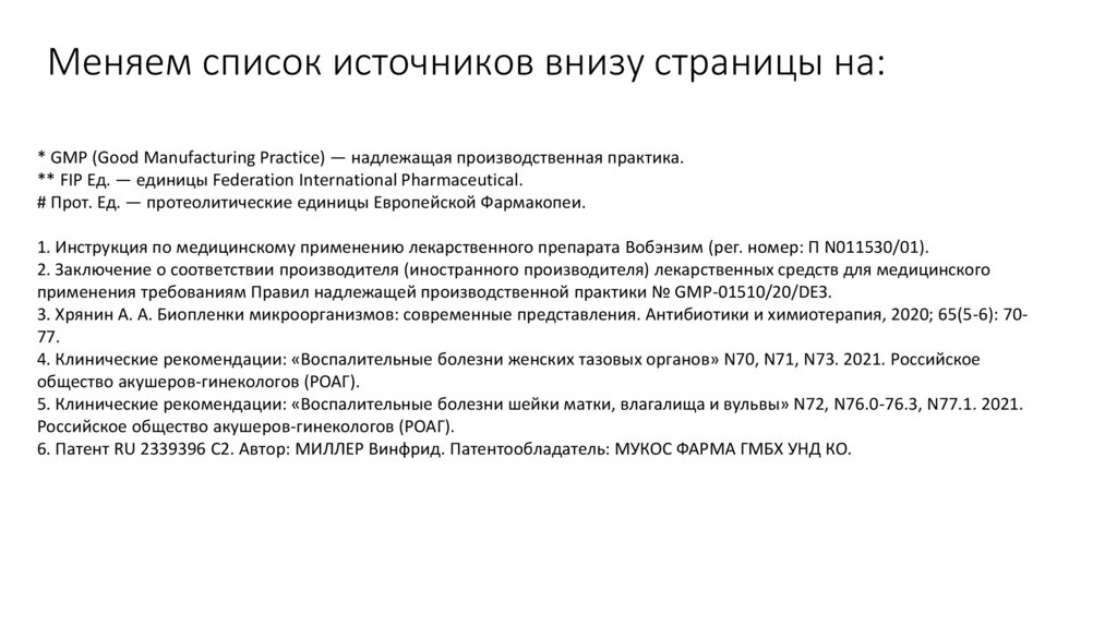 Меняем список источников внизу страницы на:* GMP (Good Manufacturing Practice) — надлежащая производственная практика.