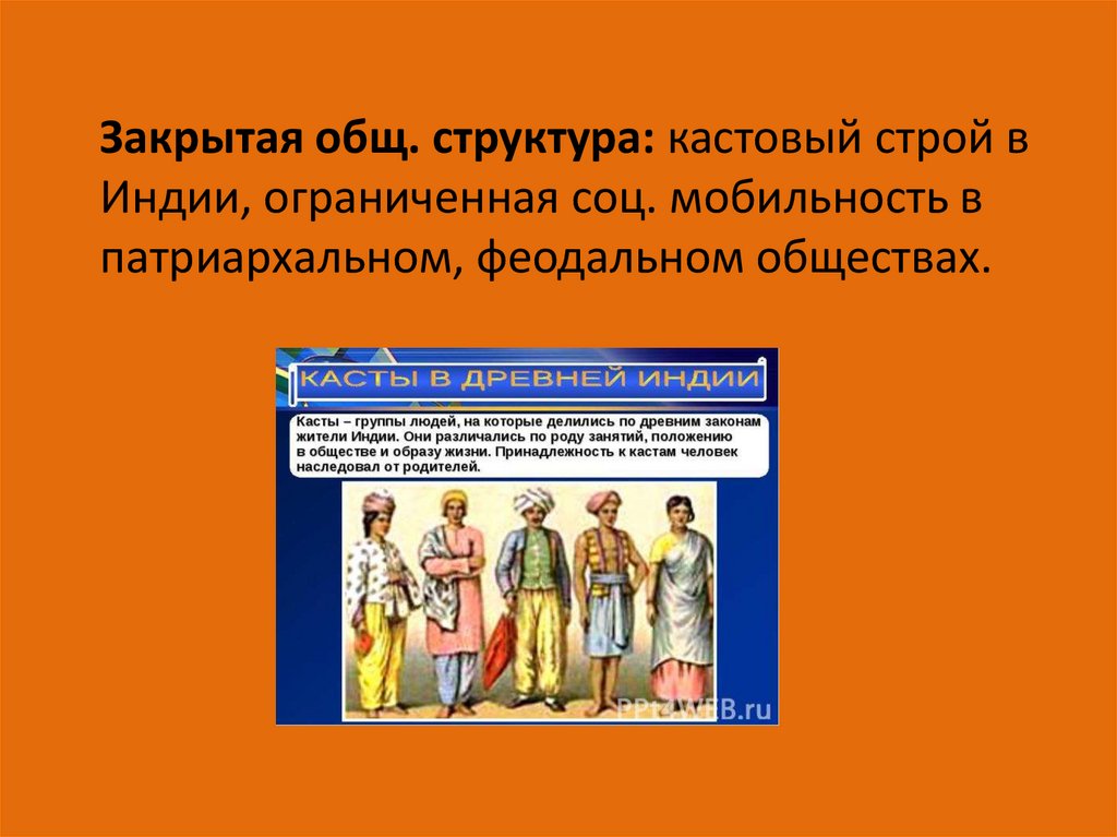 Закрытая общ. структура: кастовый строй вИндии, ограниченная соц. мобильность в