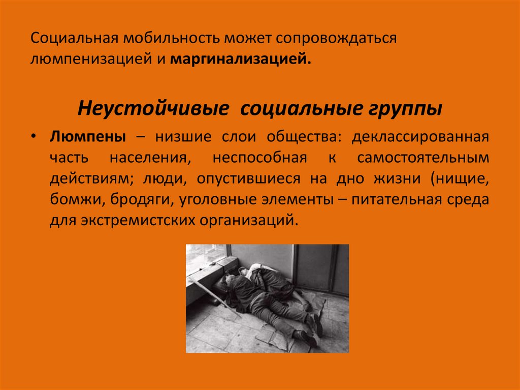 Социальная мобильность может сопровождатьсялюмпенизацией и маргинализацией.