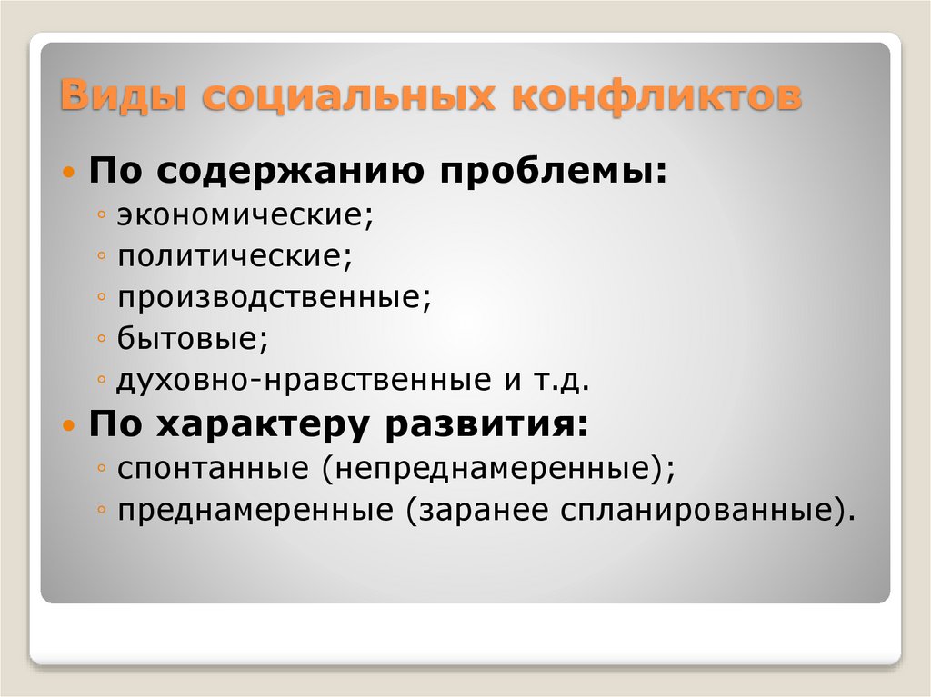 Виды социальных конфликтовПо содержанию проблемы: