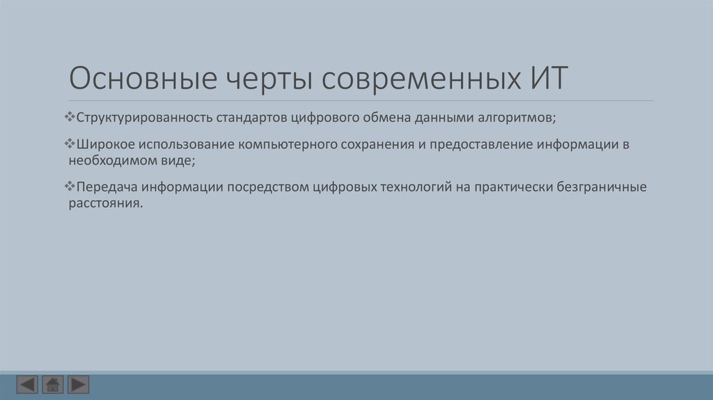 Основные черты современных ИТСтруктурированность стандартов цифрового обмена данными алгоритмов;