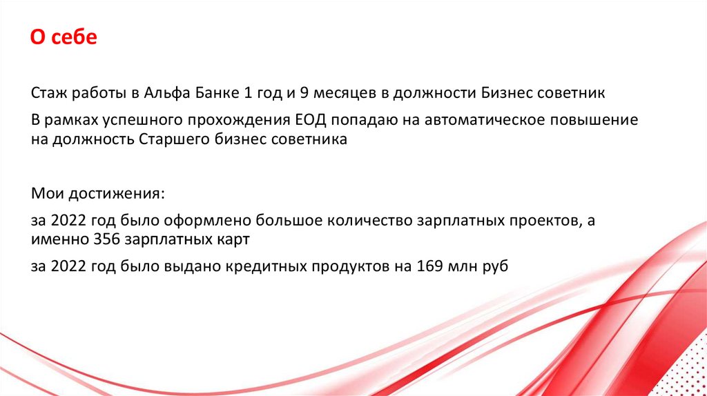 О себеСтаж работы в Альфа Банке 1 год и 9 месяцев в должности Бизнес советник