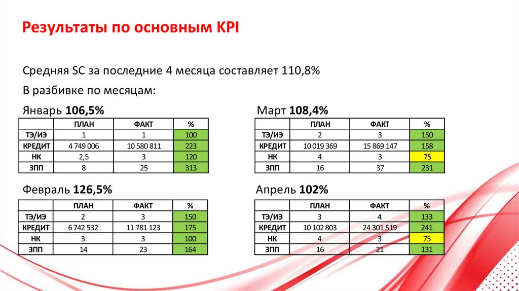 Результаты по основным KPIСредняя SC за последние 4 месяца составляет 110,8%