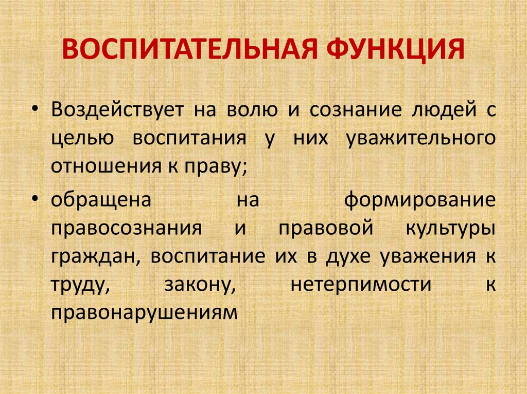 ВОСПИТАТЕЛЬНАЯ ФУНКЦИЯ• Воздействует на волю и сознание людей с