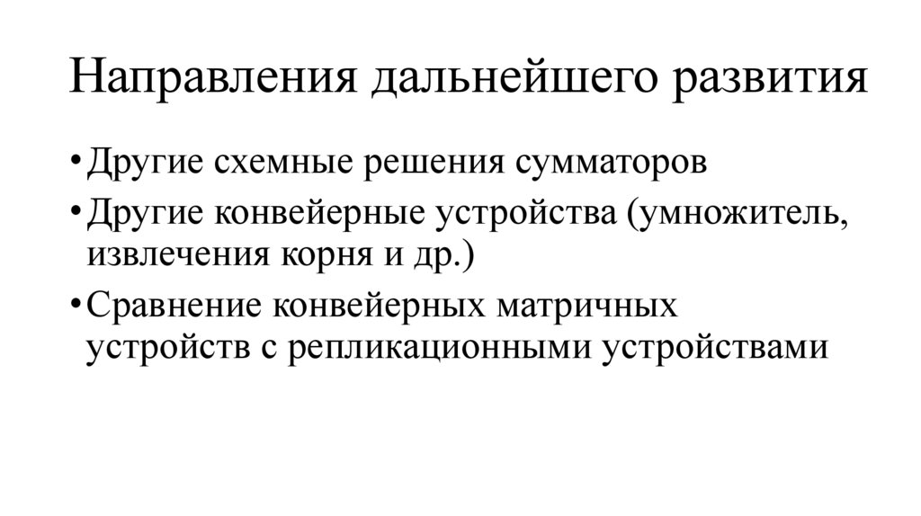 Направления дальнейшего развития• Другие схемные решения сумматоров