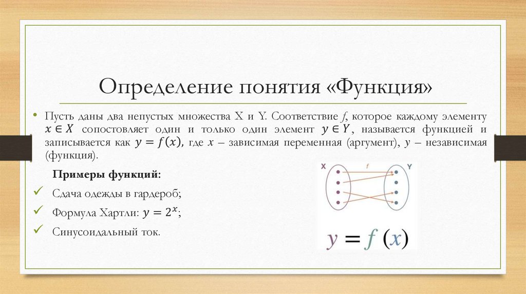 • Пусть даны два непустых множества X и Y. Соответствие f, которое каждому элементу