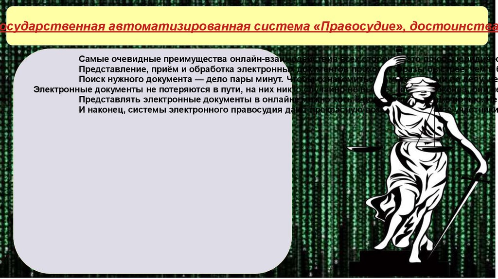 Государственная автоматизированная система «Правосудие», достоинства:Самые очевидные преимущества онлайн-взаимодействия всех сторон — это плюсы юридичес