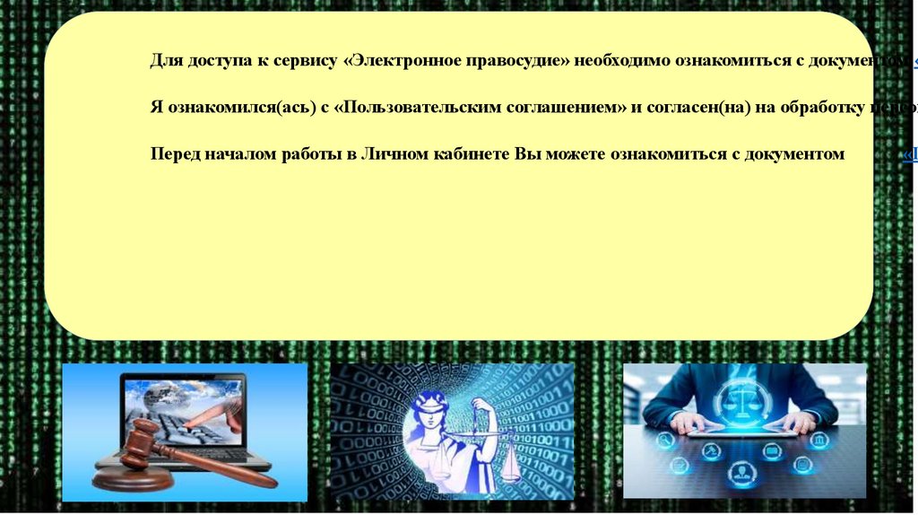Для доступа к сервису «Электронное правосудие» необходимо ознакомиться с документом «Я ознакомился(ась) с «Пользовательским соглашением» и согласен(на) на обработку персон