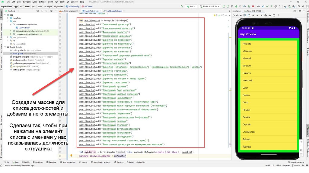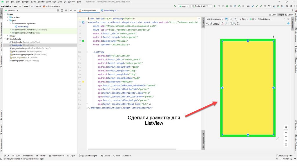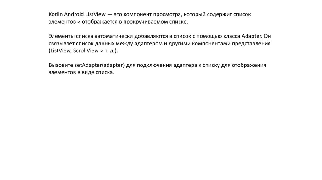 Kotlin Android ListView — это компонент просмотра, который содержит списокэлементов и отображается в прокручиваемом списке.