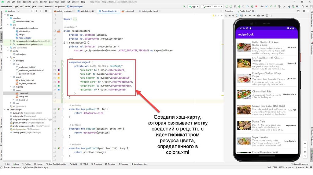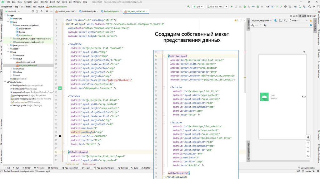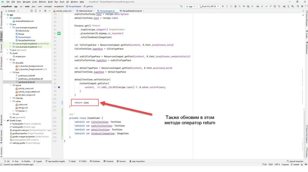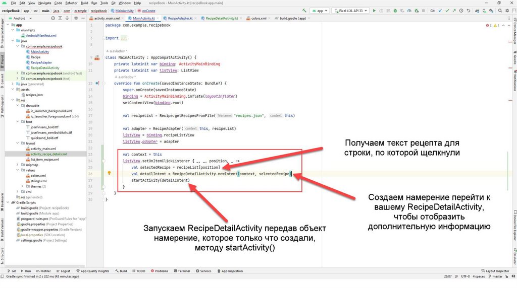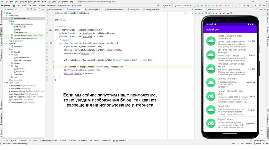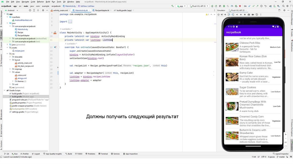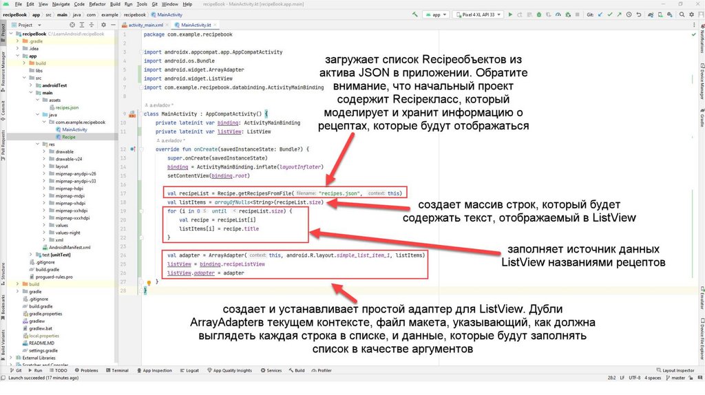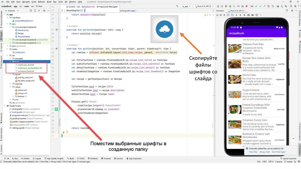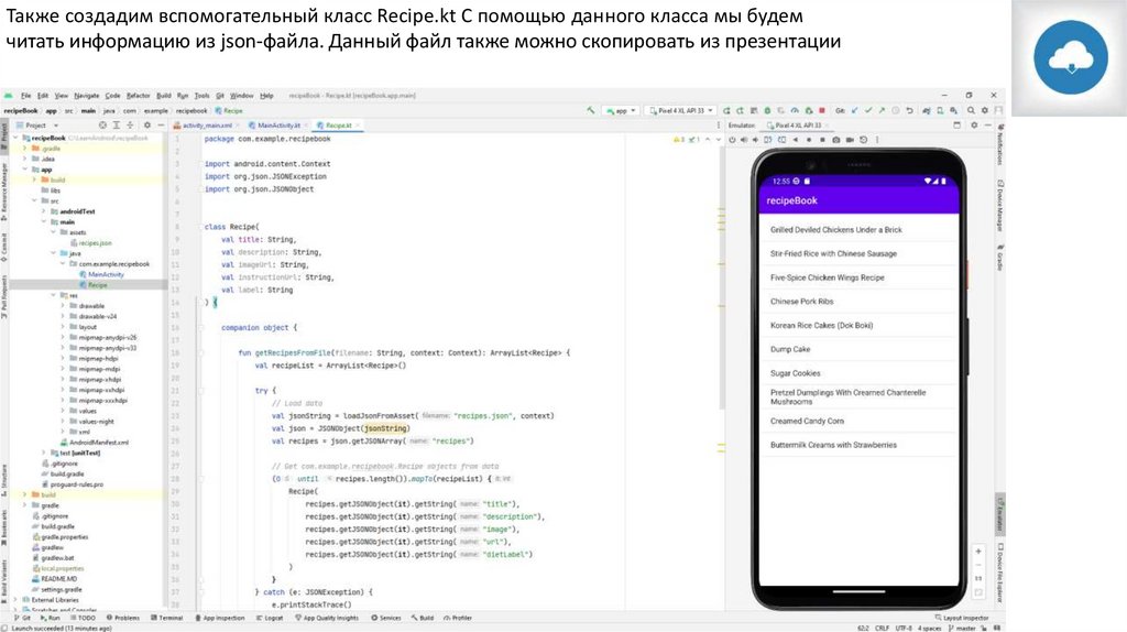 Также создадим вспомогательный класс Recipe.kt С помощью данного класса мы будемчитать информацию из json-файла. Данный файл также можно скопировать из презентации