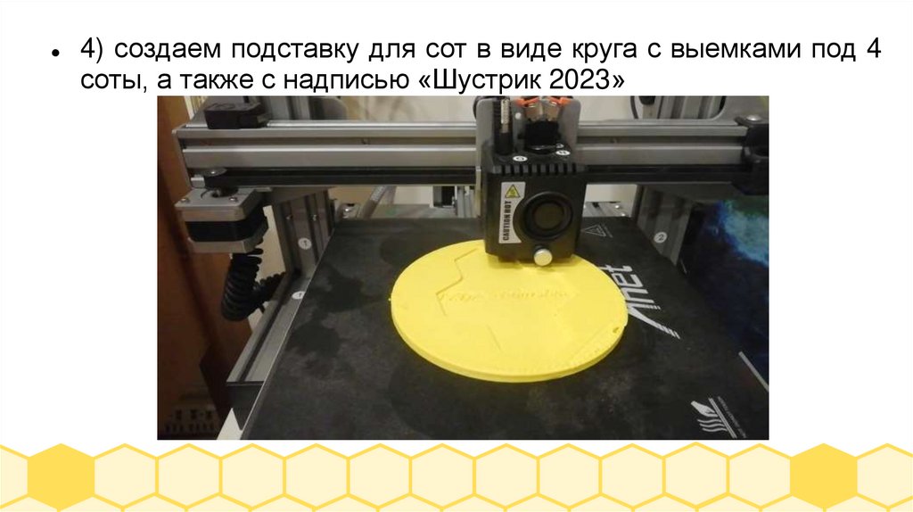4) создаем подставку для сот в виде круга с выемками под 4соты, а также с надписью «Шустрик 2023»