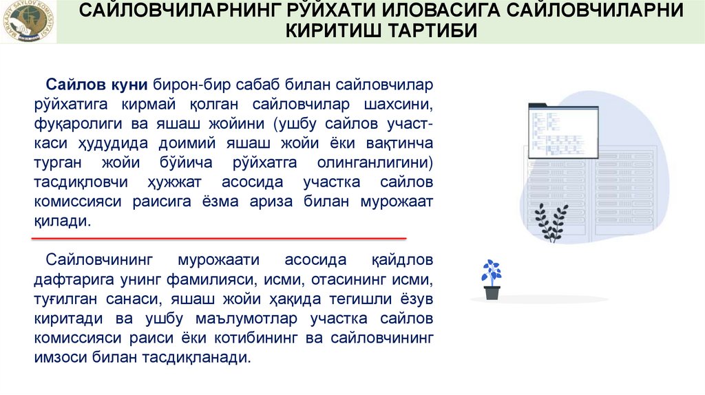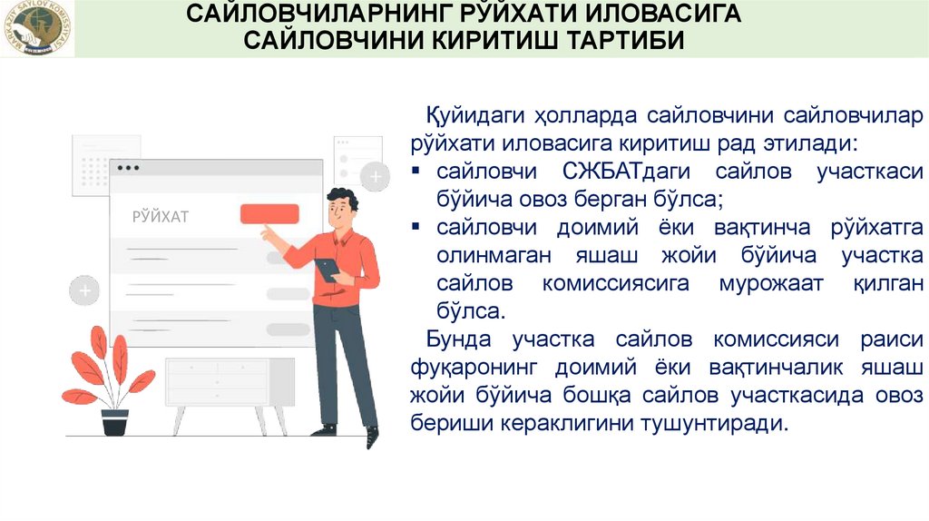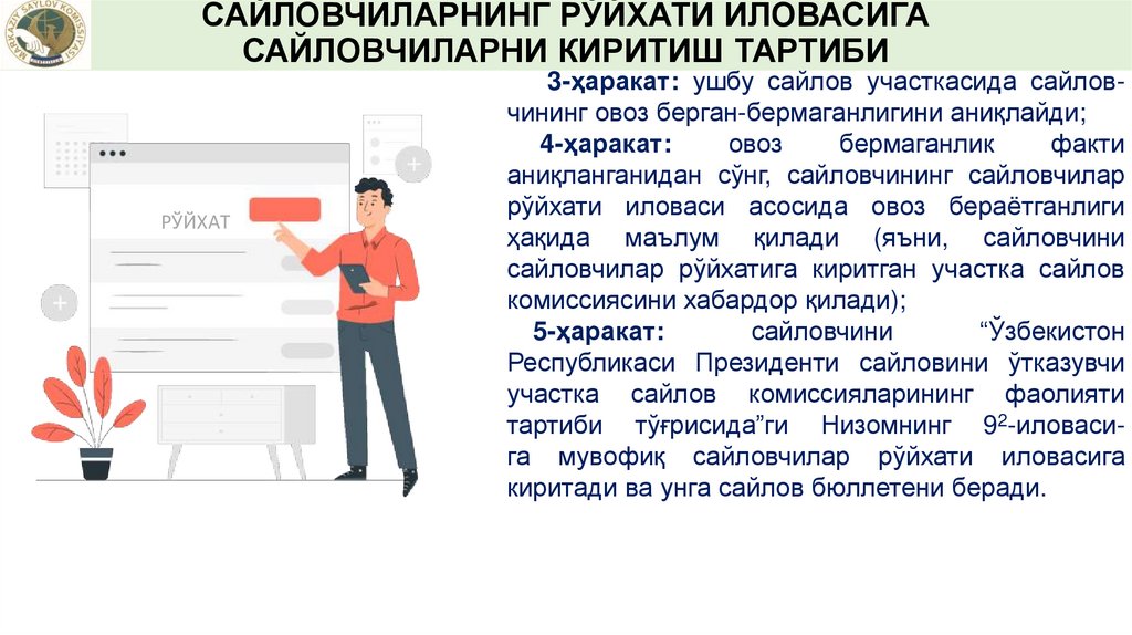 САЙЛОВЧИЛАРНИНГ РЎЙХАТИ ИЛОВАСИГАСАЙЛОВЧИЛАРНИ КИРИТИШ ТАРТИБИ