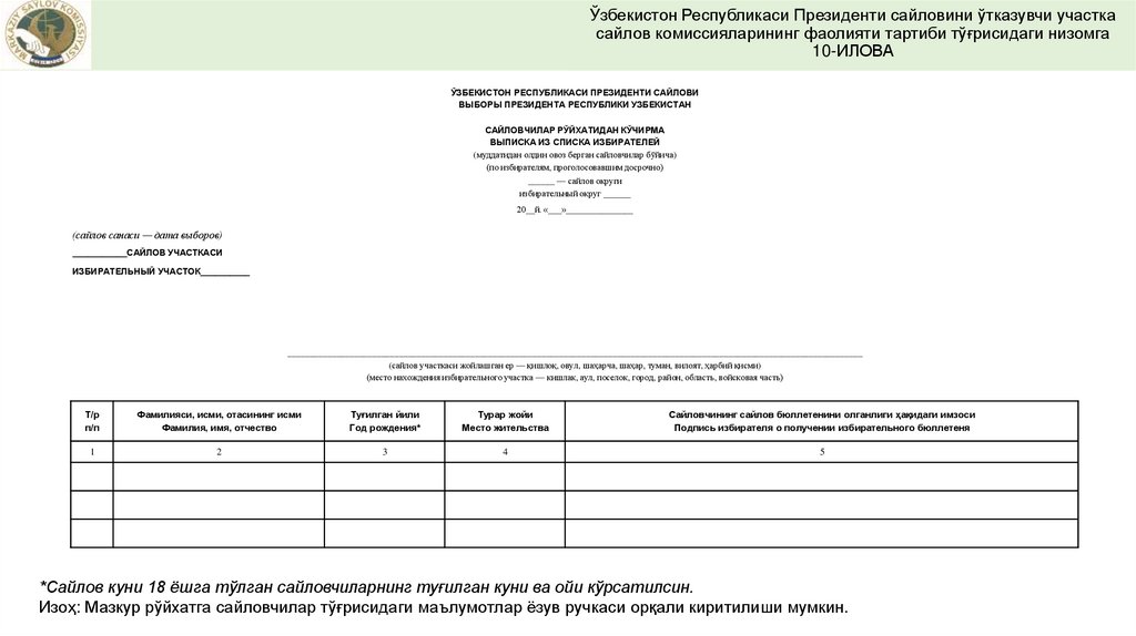 Изоҳ: Мазкур рўйхатга сайловчилар тўғрисидаги маълумотлар ёзув ручкаси орқали киритилиши мумкин.