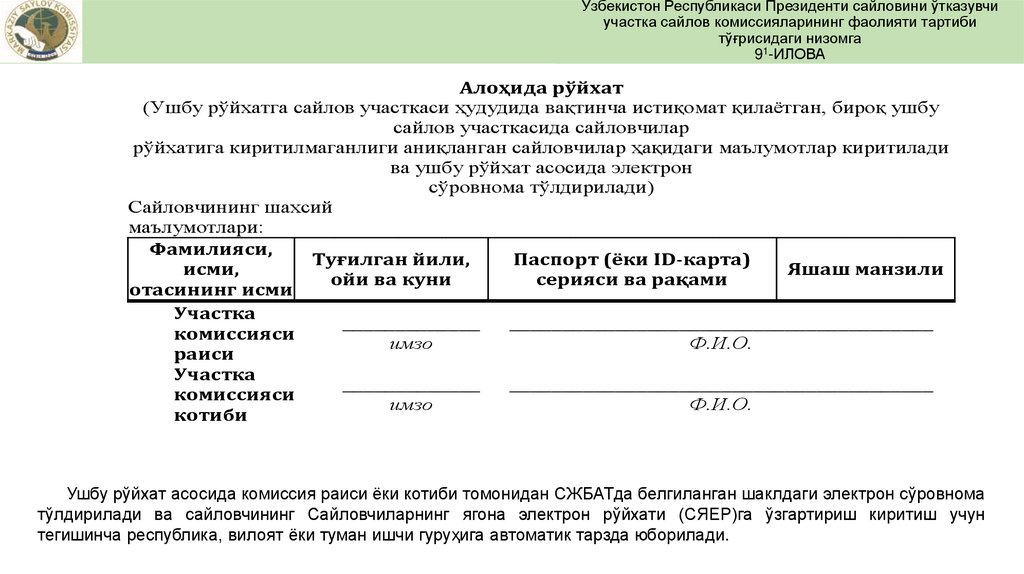 тартиби тўғрисида”ги Низомнинг 92-иловасига мувофиқ сайловчилар рўйхати иловасига