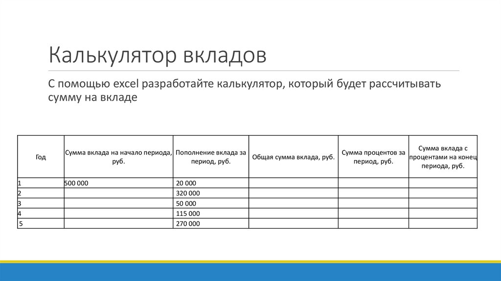 Калькулятор вкладовС помощью excel разработайте калькулятор, который будет рассчитывать