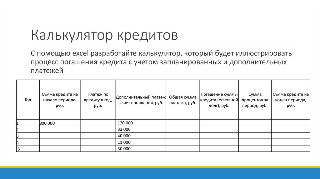 Калькулятор кредитовС помощью excel разработайте калькулятор, который будет иллюстрировать