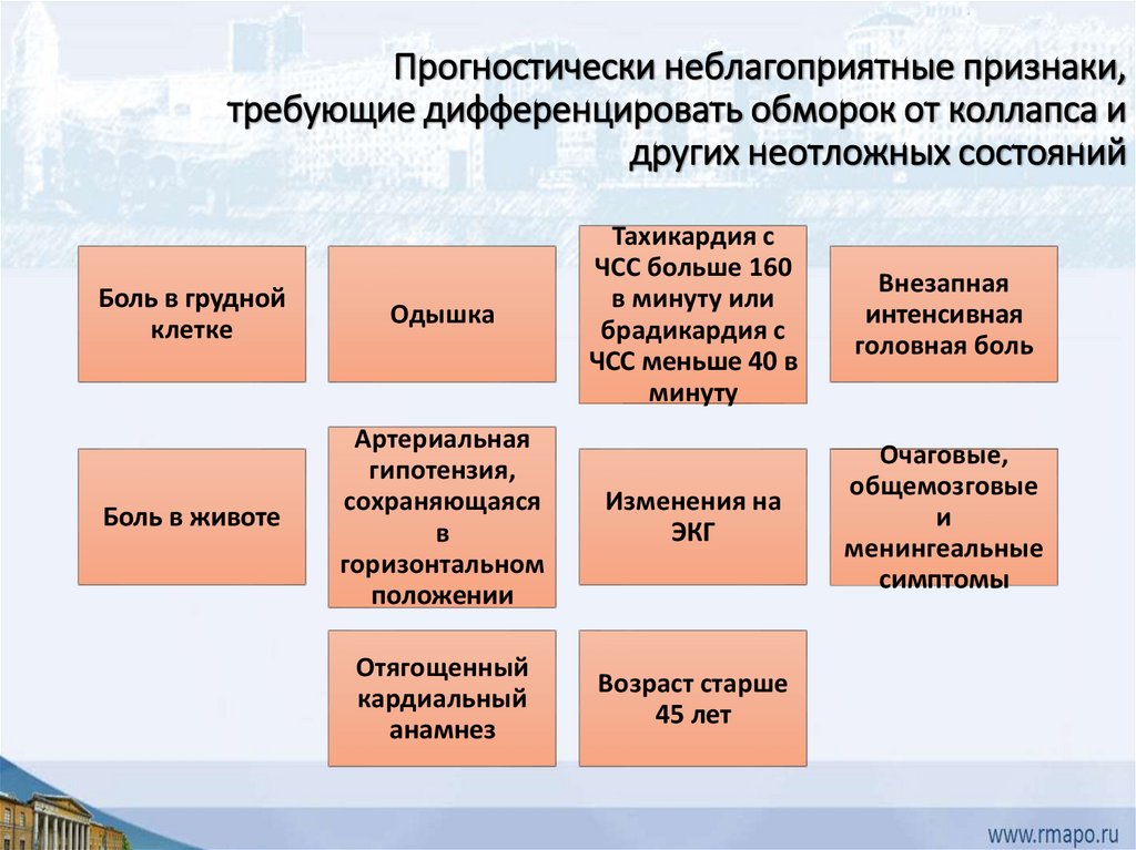 Прогностически неблагоприятные признаки,требующие дифференцировать обморок от коллапса и