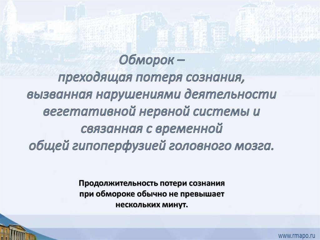 Продолжительность потери сознанияпри обмороке обычно не превышает