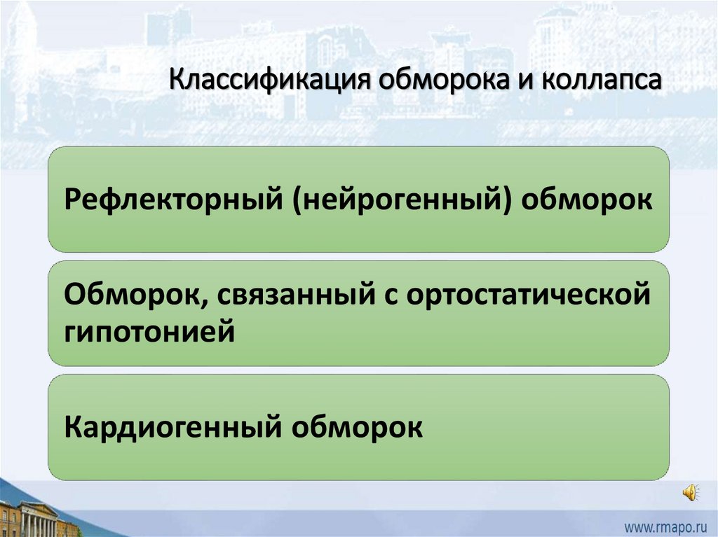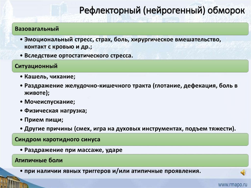 Классификация обморока и коллапсаРефлекторный (нейрогенный) обморок