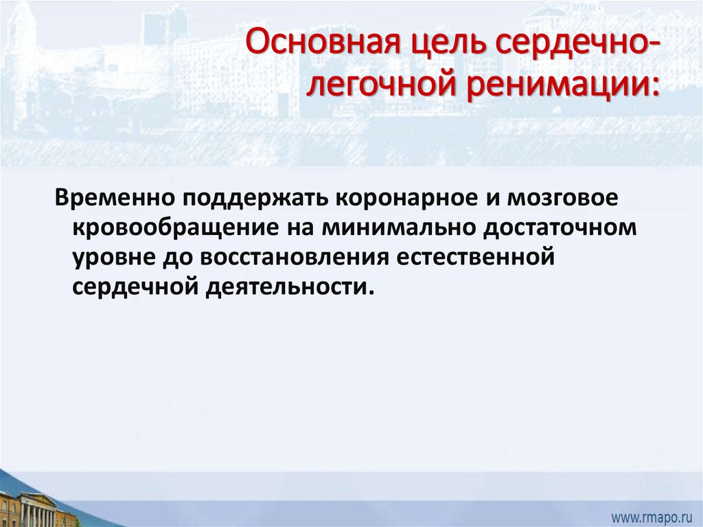 Основная цель сердечнолегочной ренимации:Временно поддержать коронарное и мозговое