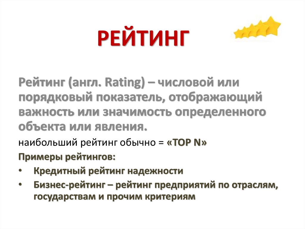 РЕЙТИНГРейтинг (англ. Rating) – числовой или
