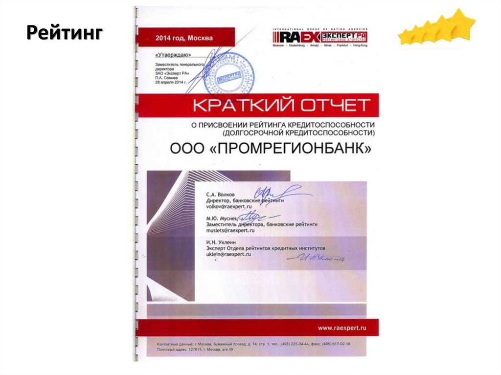• Рейтинговый отчет, заключение, сертификат