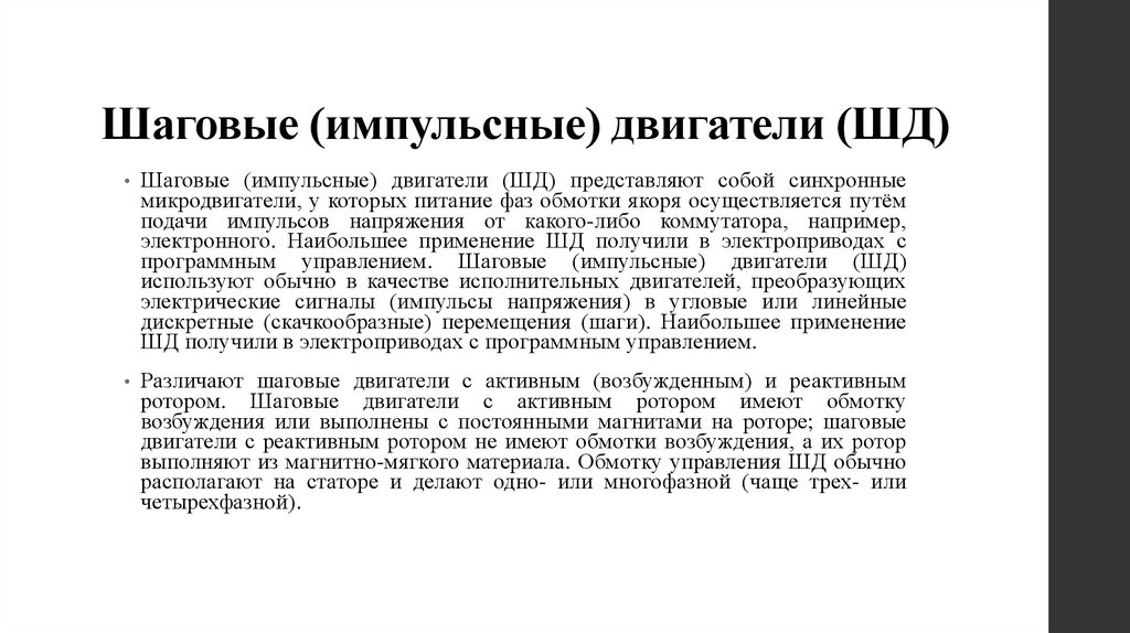 Шаговые (импульсные) двигатели (ШД)• Шаговые