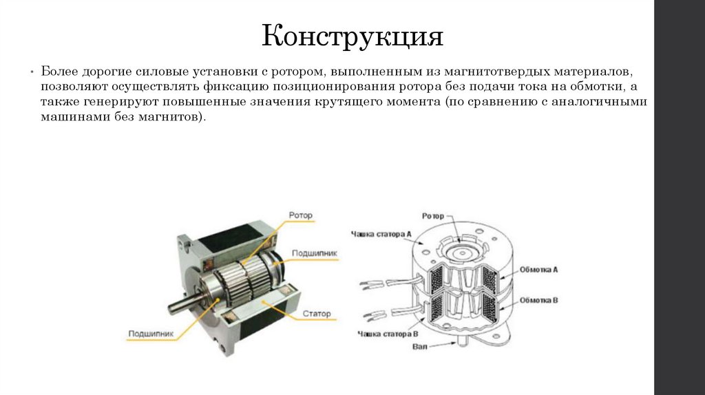 Конструкция• Более дорогие силовые установки с ротором, выполненным из магнитотвердых материалов,