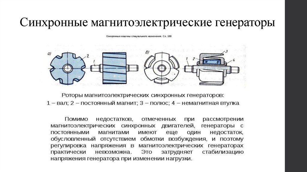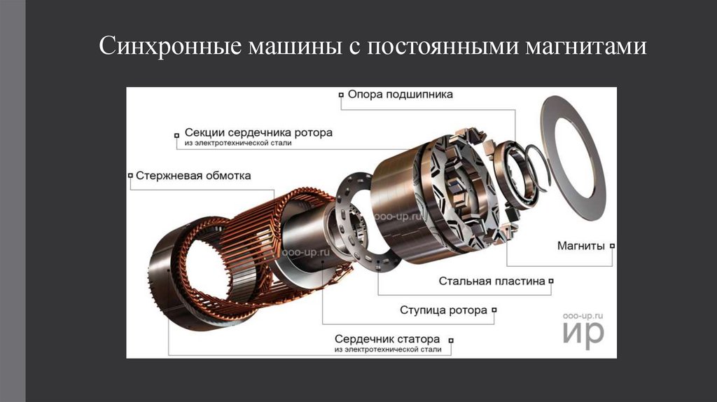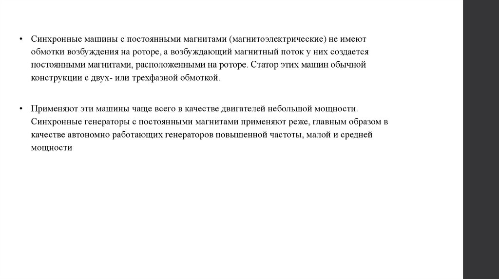 • Синхронные машины с постоянными магнитами (магнитоэлектрические) не имеютобмотки возбуждения на роторе, а возбуждающий магнитный поток у них создается