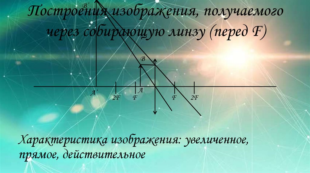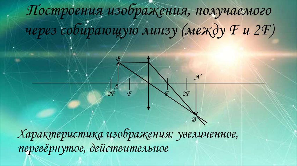 Построения изображения, получаемогочерез собирающую линзу (между F и 2F)
