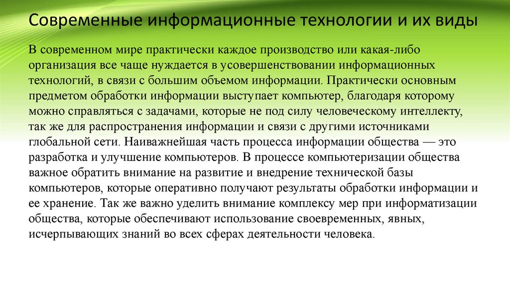 Современные информационные технологии и их видыВ современном мире практически каждое производство или какая-либо