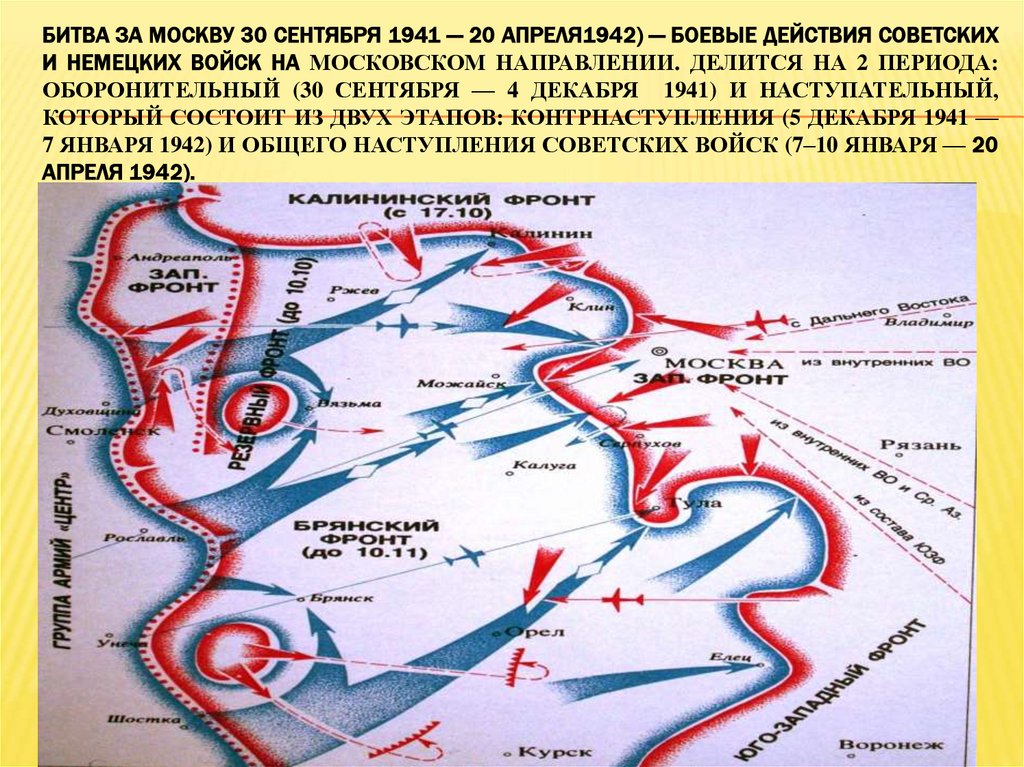 БИТВА ЗА МОСКВУ 30 СЕНТЯБРЯ 1941 — 20 АПРЕЛЯ1942) — БОЕВЫЕ ДЕЙСТВИЯ СОВЕТСКИХИ НЕМЕЦКИХ ВОЙСК НА МОСКОВСКОМ НАПРАВЛЕНИИ. ДЕЛИТСЯ НА 2 ПЕРИОДА: