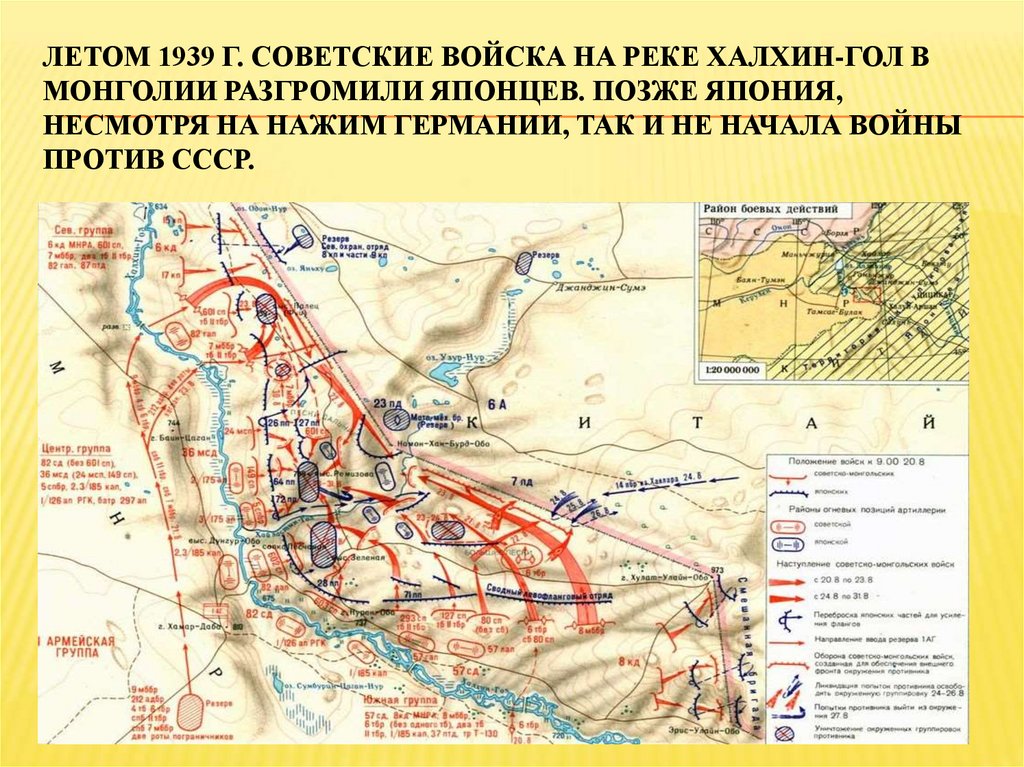 ЛЕТОМ 1939 Г. СОВЕТСКИЕ ВОЙСКА НА РЕКЕ ХАЛХИН-ГОЛ ВМОНГОЛИИ РАЗГРОМИЛИ ЯПОНЦЕВ. ПОЗЖЕ ЯПОНИЯ,
