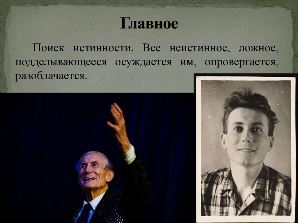 Поиск истинности. Все неистинное, ложное,подделывающееся осуждается им, опровергается,