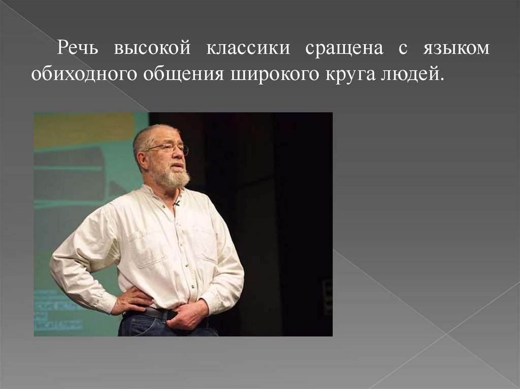 Речь высокой классики сращена с языкомобиходного общения широкого круга людей.