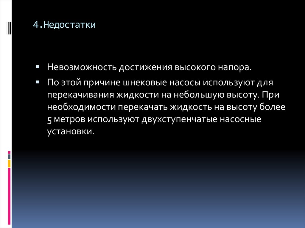 4.НедостаткиНевозможность достижения высокого напора.