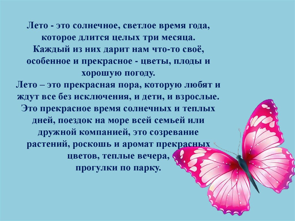 Лето - это солнечное, светлое время года,которое длится целых три месяца.