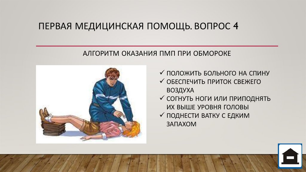 ПЕРВАЯ МЕДИЦИНСКАЯ ПОМОЩЬ. ВОПРОС 4АЛГОРИТМ ОКАЗАНИЯ ПМП ПРИ ОБМОРОКЕ