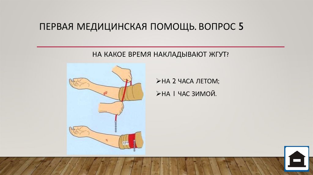 ПЕРВАЯ МЕДИЦИНСКАЯ ПОМОЩЬ. ВОПРОС 5НА КАКОЕ ВРЕМЯ НАКЛАДЫВАЮТ ЖГУТ?