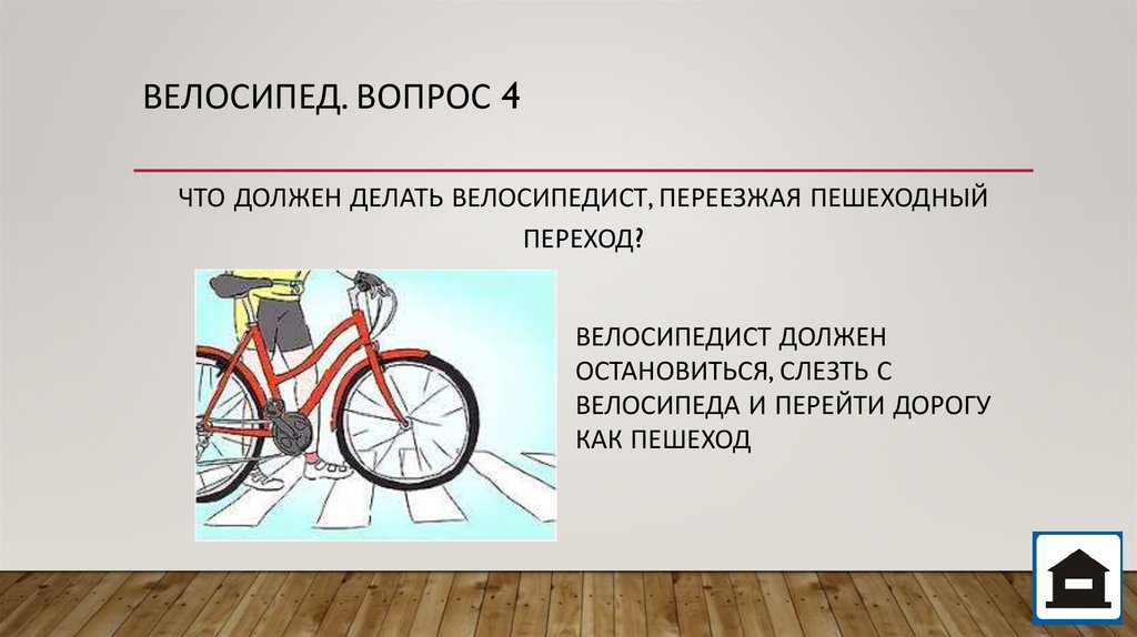 ВЕЛОСИПЕД. ВОПРОС 4ЧТО ДОЛЖЕН ДЕЛАТЬ ВЕЛОСИПЕДИСТ, ПЕРЕЕЗЖАЯ ПЕШЕХОДНЫЙ