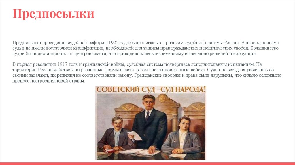 ПредпосылкиПредпосылки проведения судебной реформы 1922 года были связаны с кризисом судебной системы России. В период царизма