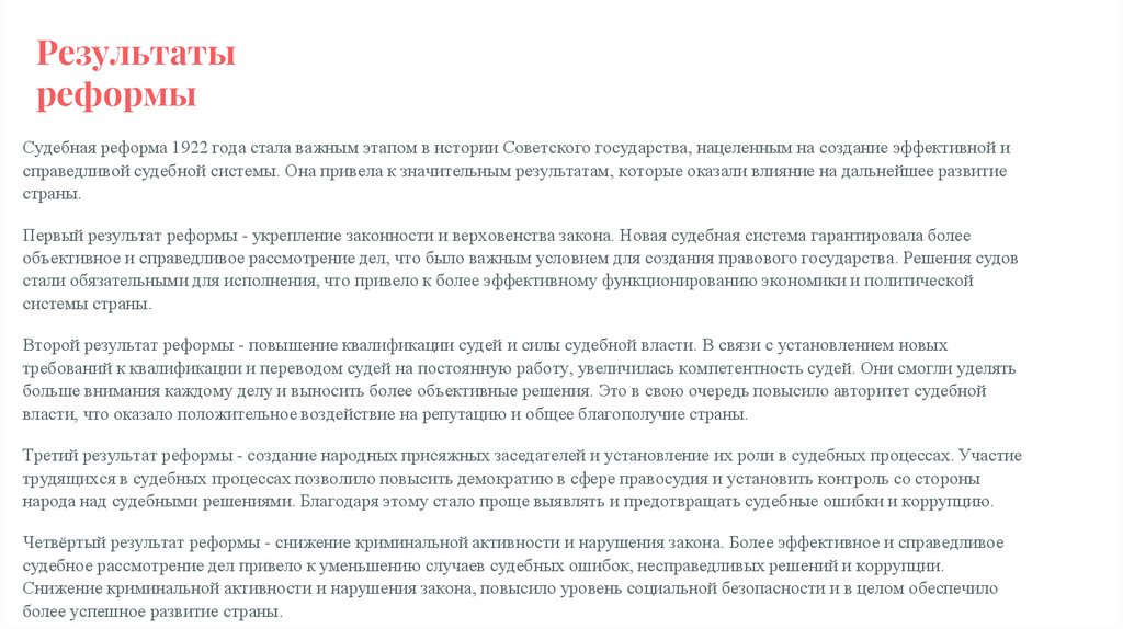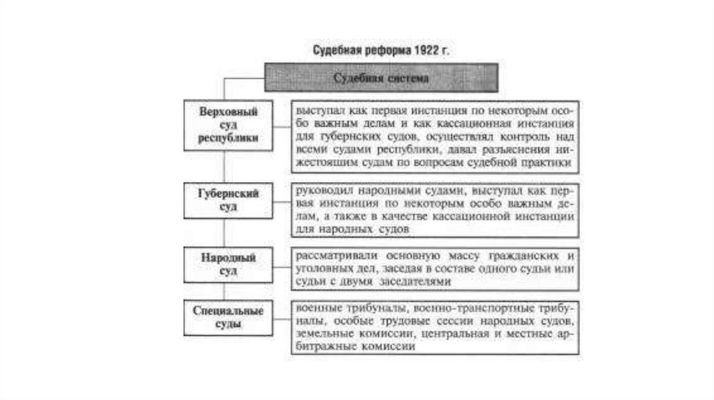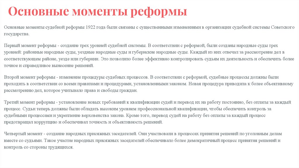 Основные моменты реформыОсновные моменты судебной реформы 1922 года были связаны с существенными изменениями в организации судебной системы Советского