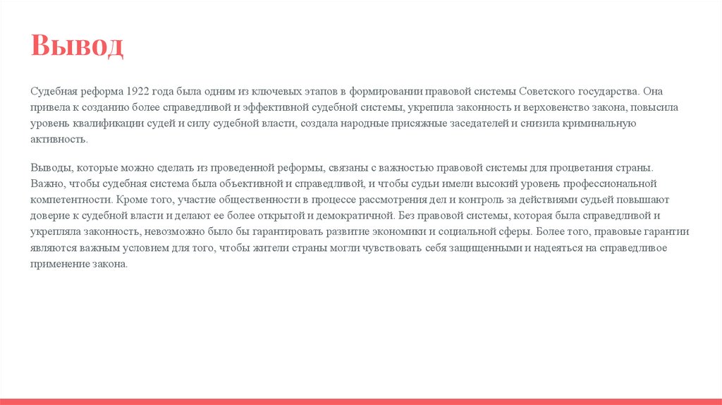 ВыводСудебная реформа 1922 года была одним из ключевых этапов в формировании правовой системы Советского государства. Она