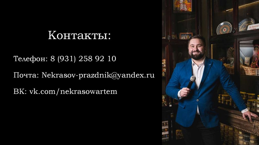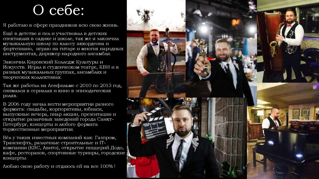 О себе:Я работаю в сфере праздников всю свою жизнь.