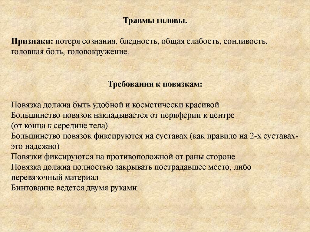 Травмы головы.Признаки: потеря сознания, бледность, общая слабость, сонливость,