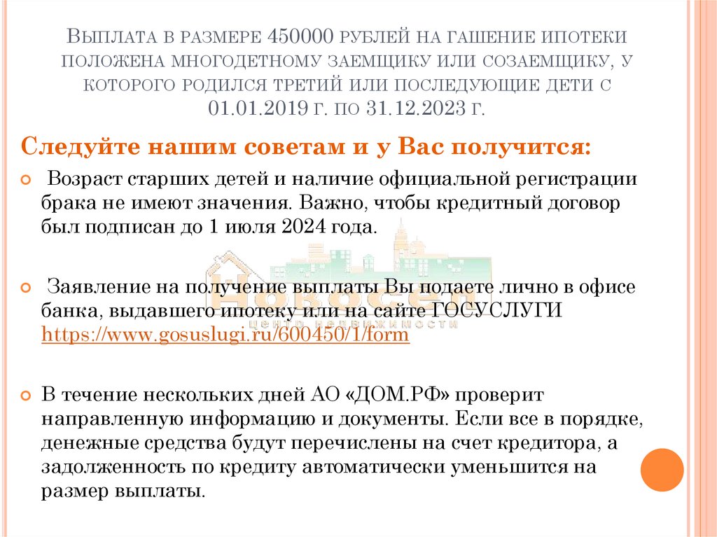 ВЫПЛАТА В РАЗМЕРЕ 450000 РУБЛЕЙ НА ГАШЕНИЕ ИПОТЕКИПОЛОЖЕНА МНОГОДЕТНОМУ ЗАЕМЩИКУ ИЛИ СОЗАЕМЩИКУ, У