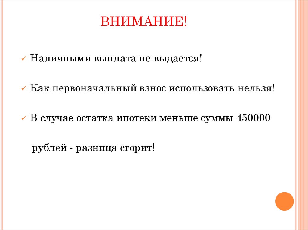В случае остатка ипотеки меньше суммы 450000