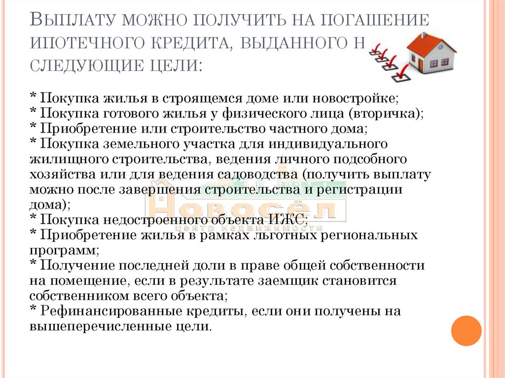 ВЫПЛАТУ МОЖНО ПОЛУЧИТЬ НА ПОГАШЕНИЕИПОТЕЧНОГО КРЕДИТА, ВЫДАННОГО НА